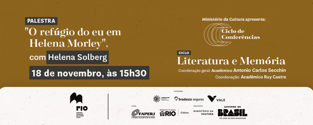A cineasta Helena Solberg conduzirá a conferência "O refúgio do eu em Helena Morley", com exibição do filme "Vida de menina", na terça-feira, 18 de novembro, excepcionalmente às 15h30. A coordenação será do Acadêmico Ruy Castro. A entrada é franca.